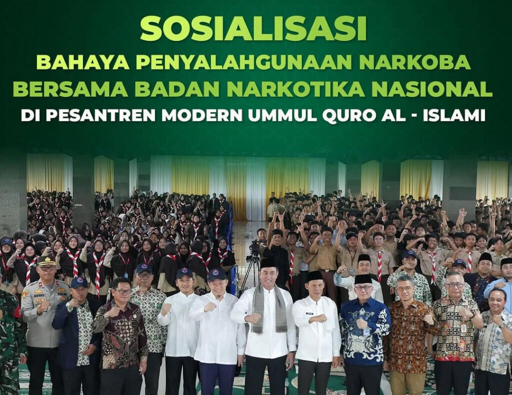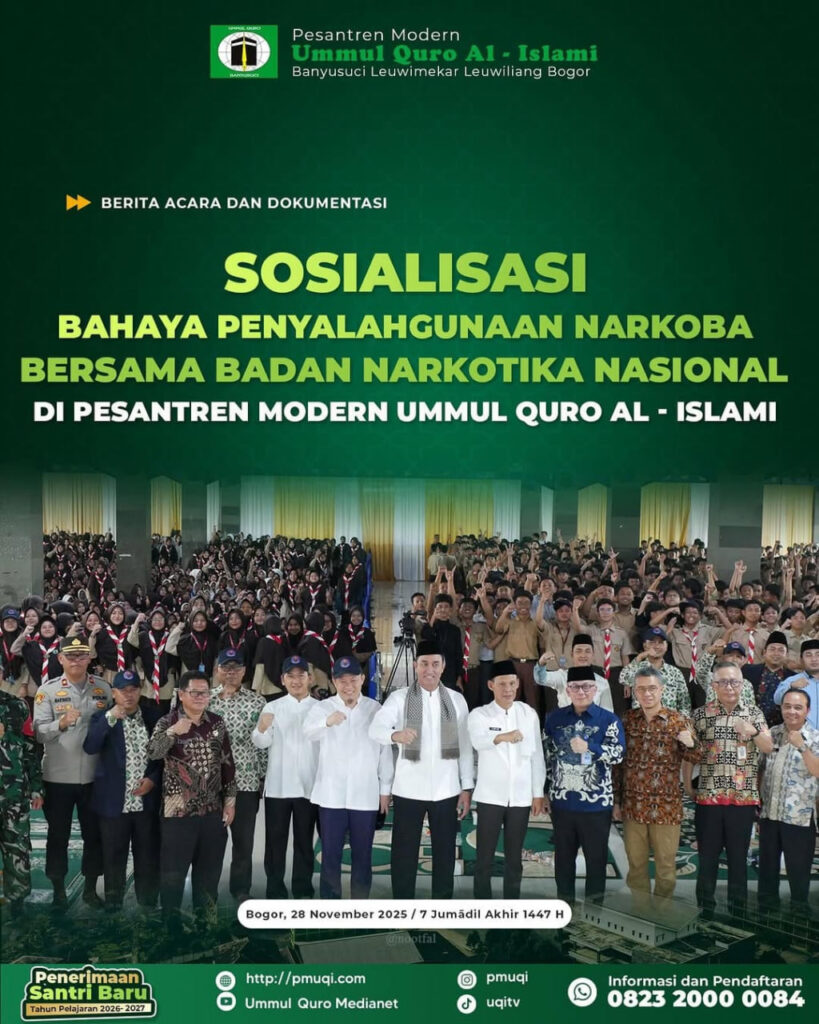 PMUQI — Pesantren Ummul Quro Al Islami secara resmi mendeklarasikan komitmen anti-narkoba melalui seminar sosialisasi bahaya penyalahgunaan narkotika bersama Badan Narkotika Nasional Republik Indonesia (BNN RI) dan Pemerintah Kabupaten Bogor. Acara yang digelar pada Jumat, 25/11/ 2025, ini dihadiri langsung oleh Kepala BNN RI, Komjen Pol. Suyudi Ario Seto, dan Wakil Bupati Bogor, H. Ade Ruhandi, S.E.